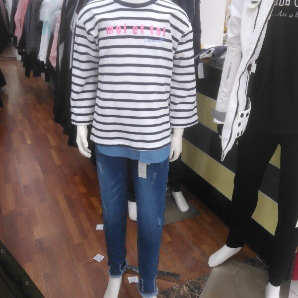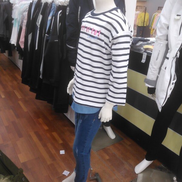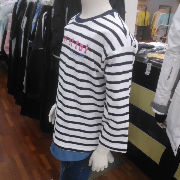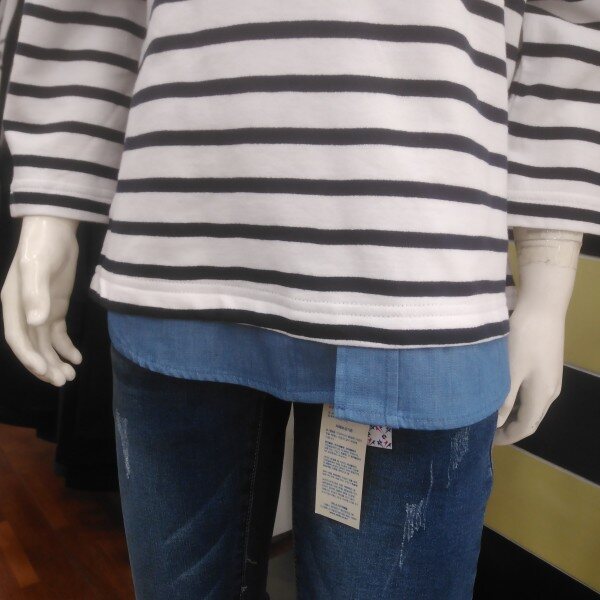 팔부 소매가 귀엽습니다.진 레이어드 처리된 아래 단 부분이 캐쥬얼 합니다.초여름엔 5부 바지와 짧은 반바지에도 어울리는 아이템입니다.