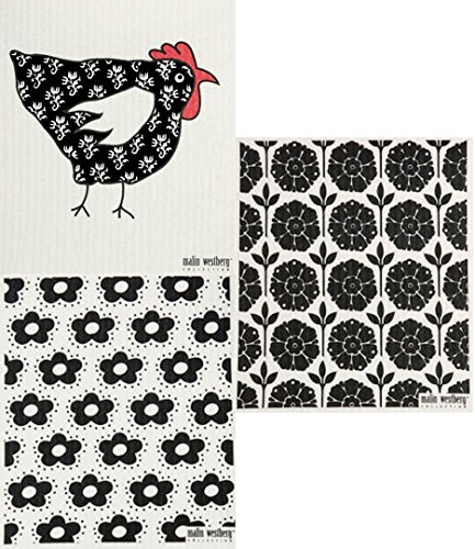 Swedish Dishcloth - (BX) Set of 3 BLACK Rooster + Flowers