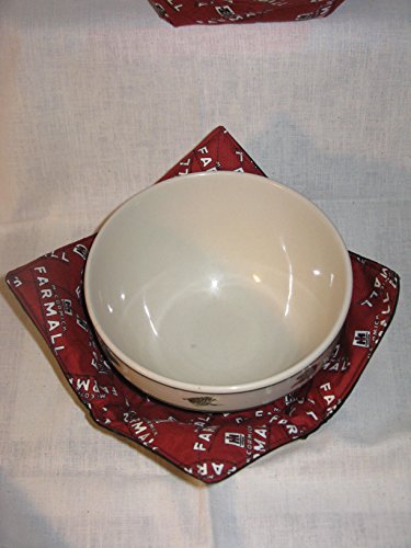 Product Description SET OF 2 International Harvester - Farmall Soup Bowl Cozies These are handmade in my Washington State home with 100% cotton fabrics, batting and thread. They measure approximately 10 1/2" X 10 1/2" and are approximately 3" deep. I have never used my cozies in the microwave, I do know people say it is safe, I just don't. We transfer the hot bowls from the microwave, to the cozies. Machine wash and dry. 0