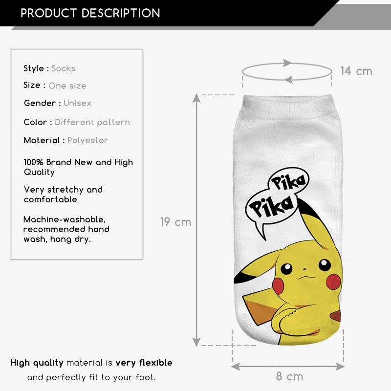 Gender: Female,Women,Lady, Girls ,Boys Type1: Socks for women Type2: socks women's Type3: cartoon socks Pattern: Pikachu socks, Pokemon socks Type5: fashion socks Type6: casual socks Type7: Free shipping Type8: cheap price Type9: present for child