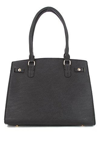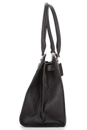 You will love this tote by BCBG Paris. Faux leather. Chic lock and key design. Three interior pockets. Center pocket zips to close. Side wall zip pocket with the other side wall having 2 open slots for cells phone, keys, etc. Approximately 10.5" x 13" x 7".Feature