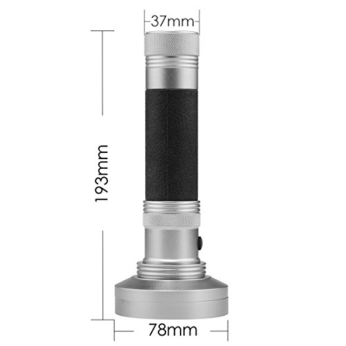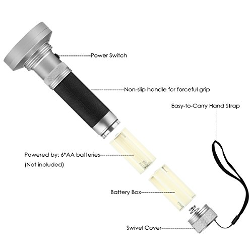 Easy to operate: Powered by 6*AA 1.5V batteries (but not include 6*AA 1.5V batteries) Lighting time - 20 hours, with only one push-button, simple & easy to operate the black light LED flashlight