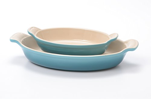Studio : Le Creuset Publisher : Le Creuset Product Description Treat yourself to something delicious with this two piece set of Le Creuset au gratin dishes. These incredibly versatile cast stoneware pieces are perfect for all of your needs, from baking to serving and even storing. Each cookware piece is fired at 2156 degrees Fahrenheit, making them virtually nonporous so they don't absorb flavors, odors, or moisture. The enameled surface also makes them incredibly resistant to scratches, chipping, and staining. The Heritage style flared handles allow for safe maneuvering directly from oven to table. Perfect for individual servings, these unique little dishes offer huge possibilities. Serve up some snacks, appetizers, or your very own creme brulee, and enjoy the easy clean-up when you're through. Suitable for use in the oven up to 500 degrees Fahrenheit, these dishes can be broiled or baked. Backed by a five year manufacturer's warranty, they are also dishwasher safe for easy cleanup. 1.7 quart au gratin -- 8" L x 14" W x 2-1/2" H; 24 ounce au gratin -- 8" L x 5-3/4" W x 1-1/4" H 0