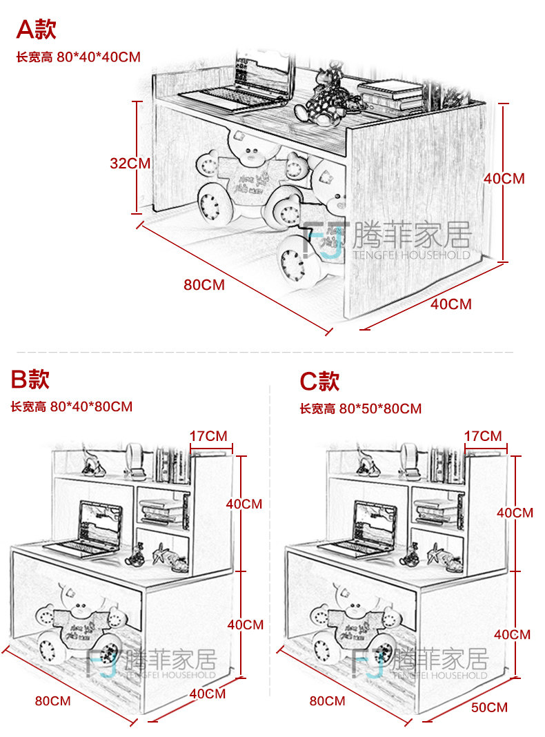 | T306 | 书桌 | A款:长80cm ?宽40cm ?高40cm B款:长80cm ?宽40cm ?高80cm C款:长80cm ?宽50cm ?高80cm | 1 | 纸箱包装? | |