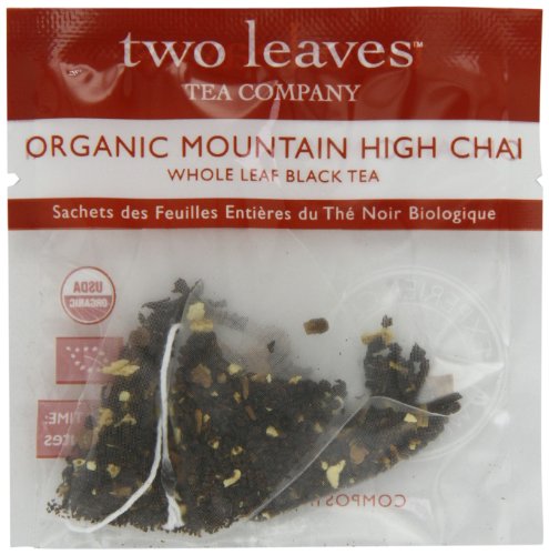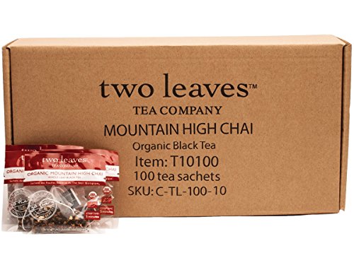 -. Binding : Grocery -. Brand : Two Leaves Tea Company -. EAN : 0894058000774 -. Feature : Whole Leaf Black Tea Sachets / Origin: India / Caffeine: Some buzz, 1/2 cup coffee / Steep Time: 5 Minutes / 100 tea sachets of Organic Mountain High Chai Black Tea / Tangy, fun full-bodied flavor layered with a rich, spicy finish / Full caffeine;less than coffee / Rich Assam black tea layered with cinnamon, cardamom, clove, and orange peel / Hills grown in Sri Lanka -. Label : Two Leaves Tea Company -. Manufacturer : Two Leaves Tea Company -. Model : T10100 -. MPN : T10100 -. NumberOfItems : 1 -. PackageQuantity : 1 -. PartNumber : T10100 -. ProductGroup : Grocery -. ProductTypeName : GROCERY -. Publisher : Two Leaves Tea Company -. ReleaseDate : 2006-04-19 -. Studio : Two Leaves Tea Company -. Title : Two Leaves Tea Company Organic Mountain High Chai Black Tea, 100-Count -. UPC : 894058000774