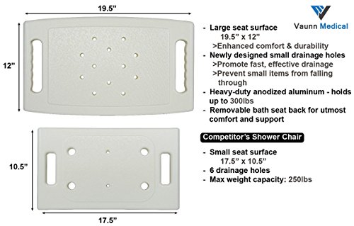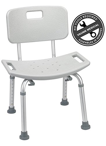 Studio : Vaunn Publisher : Vaunn Product Description The Vaunn Medical Deluxe Spa Shower Chair offers a comfortable and safe solution to any fall-risk individuals or seniors who have problems standing while showering. Constructed of strong 1" anodized aluminium frame with angled legs and non skid rubber tips, this shower chair is both sturdy and durable. Its wide, contoured anti-bacterial polystyrene seat offers good support and hygiene for individual during use. The drainage holes on the seat is designed to allow water to be drained effectively thereby reducing the risk of slipping. Our tool-free assembly also makes it easy for any one in the family to assemble for use within minutes. The Eva Medical Shower Chair is safe, hygienic, easy to use and rust resistant. 0