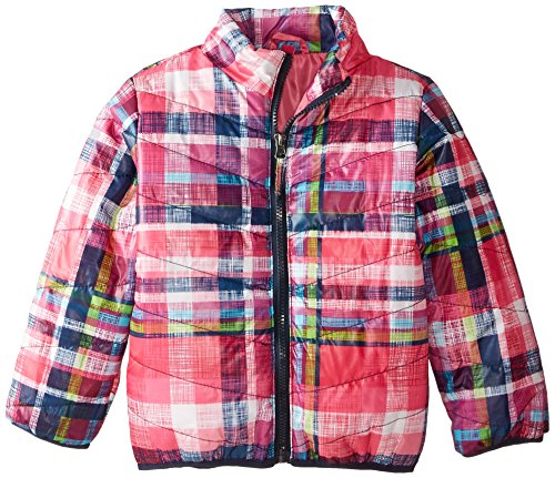 Plaid jacket features chevron quilting, zip front, and standing collar