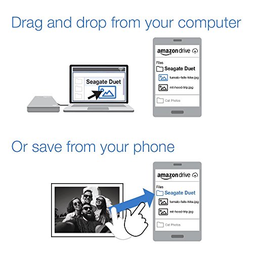 Seagate Duet is a portable hard drive that syncs with Amazon Drive, giving you dual backup for files, photos and videos. For anywhere access, use the Amazon Drive mobile app. It links with your Seagate Duet, allowing you to back up, view and share your files using a tablet or smartphone.