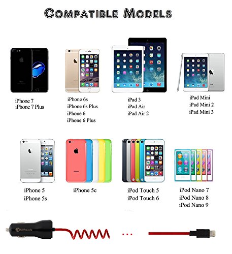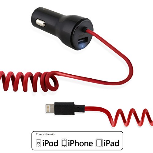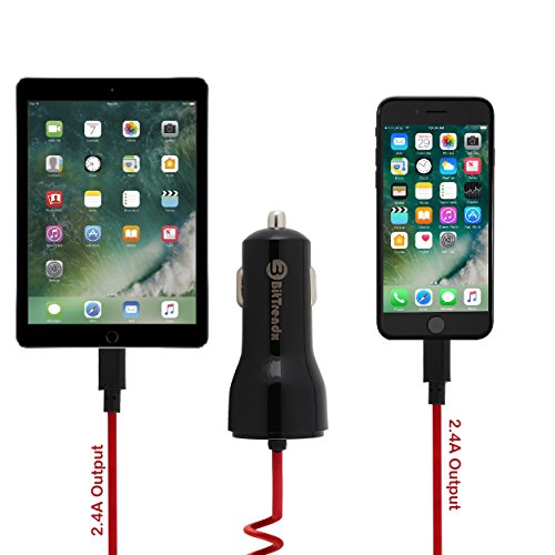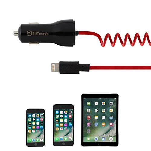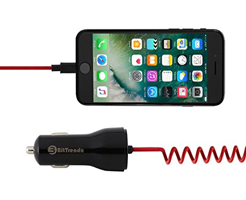 iPhone Car Charger, BitTrendx Adaptive Smart Apple Lightning Car Charger with Tangle-Free Coiled Cable for iPhone 7 7 Plus 6S 6S Plus SE 6 6 Plus 5 5S 5c iPad Plus Extra USB Port (Black / Red)