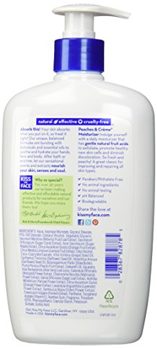 -. Binding : Misc. -. Brand : Kiss My Face -. Feature : 1 Piece - 16oz / Softens your Skin with Olive Oil, Aloe Vera, Natural Herbs and Flowers / Contains Olive Oil to care for the Skin and Aloe Vera to Moisturize it / Protects your Skin all day and Revitalizes it at Night / Contains No Animal Ingredients or Artificial Colors -. Label : Kiss My Face -. Manufacturer : Kiss My Face -. PackageQuantity : 1 -. ProductGroup : Beauty -. ProductTypeName : BEAUTY -. Publisher : Kiss My Face -. Studio : Kiss My Face -. Title : Kiss My Face Moisturizer Peaches & Creme