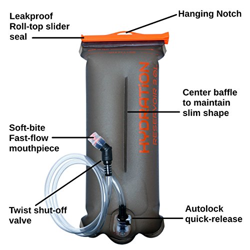 -. Feature : DRIP-FREE & LEAK PROOF - Premium military grade hydration pack bladder has twist shut-off valve on mouth piece that won't drip! Unbreakable leak proof water reservoir, roll-top seal, large opening, perfect for hiking, biking, running. Hydration bladder quick-release shutoff valve won't leak when detaching tube from water bladder. / PERFECTLY TASTE FREE - Non-toxic hydration bladder 2 liter capacity gives you taste-free water while climbing, cycling, running, hiking. FDA approved, BPA free. Quick-flow hydration bladder water reservoir includes soft-bite mouthpiece to stay hydrated & energized. / STAY LIGHT & BALANCED WHILE ON THE MOVE - No more water bottles! Lightweight, hands-free water storage bladder bag improves balance with center baffle for a hydration pack bladder w/ less slosh. Slim profile reservoir water bladder loads quickly into your hiking / camping backpack, Camelbak or Hydropak. / ASSEMBLES FAST & FILLS FAST - Fill, close, load and enjoy! Large opening for quick reservoir fill. Convenient quick-release tube detaches fast from bladder bag, rounded corners for fast & easy clean, drying & storage. Lightweight, flexible material collapses flat. / LIMITED TIME ONLY - Satisfaction guaranteed! Our hydration bladder is available today on Amazon Prime at a reduced price. But we only have a limited number that we can sell at this price. Click the ADD TO CART button at the top of this page to buy with confidence!