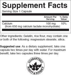 -. Feature : Calcium complexed with lactic acid / Provides calcium for bone support / 100 mg of elemental calcium in each capsule
