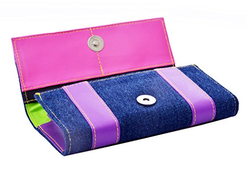 This is very beautiful Blue Color and Purple Strip Clutch Wallet Card Holder with Three Compartments for women and Fully man made you can Put into bills, change, credit cards, photo, ID card, business card, cellphone etc it is very comfort way to handle all this thing with you all the time and every where and also It is very elegant and suitable for many occasion like party, shopping, restaurant etc