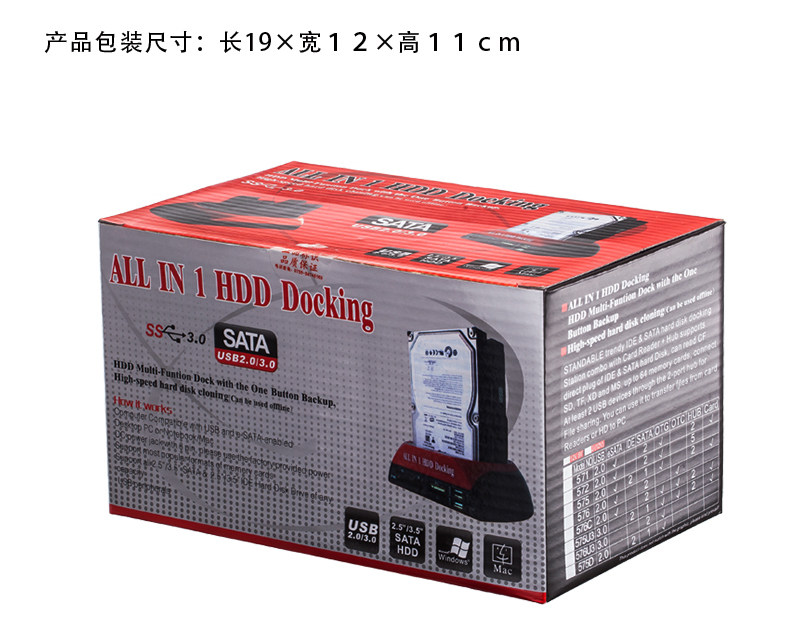 ⊙可连接存储设备:SATA和IDE接口硬盘,可接2.5寸笔记本SATA和IDE硬盘和3.5寸台式机SATA和IDE硬盘,支持多功能读卡器(XD/CF/MD/TF/MS/SD)