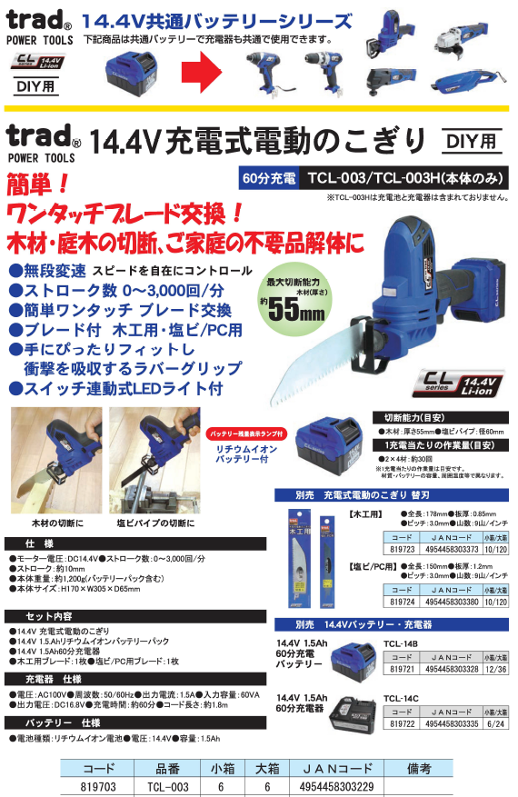 trad 充電式電気ノコギリ(DIY用 電ノコ) TCL-003対応