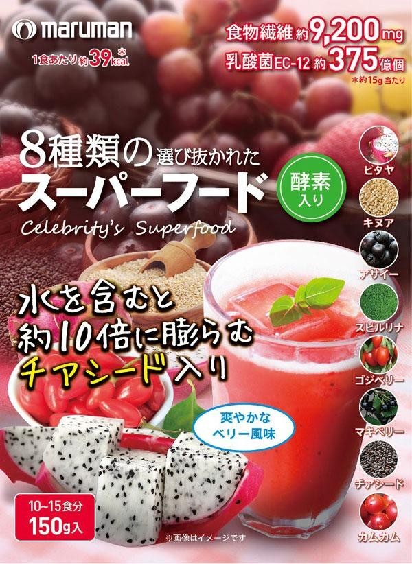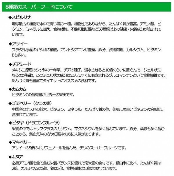 | 原材料 | 難消化性デキストリン(水溶性食物繊維)、ラズベリー果汁末、チアシード、アサイー(果肉)、カムカム果汁末、マキベリー果汁末、レッドドラゴンフルーツエキス末、キヌア、ストロベリー果汁末、植物発酵エキス(デキストリン、甜菜糖、黒砂糖、麦芽糖、ヨモギ、ウコン、ドクダミ、キダチアロエ、高麗人参、大豆、バナナ、山芋、リンゴ、その他)、クコの実末、スピルリナ末、乳酸菌(殺菌)、加工澱粉、香料、酸味料(クエン酸)、着色料(ビートレッド、モナスカス)、甘味料(スクラロース、アスパルテーム・L-フェニルアラニン化合物)、ビタミンC、ビタミンE、ナイアシン、パントテン酸Ca、ビタミンB1、ビタミンB6、ビタミンB2、ビタミンA、葉酸、ビタミンD、ビタミンB12、(原材料の一部に乳、大豆、山芋、リンゴ、バナナを含む) |