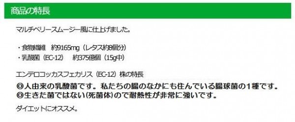 | 栄養成分 | 15gあたり:熱量39.45kcal、食物繊維9165mg、乳酸菌(EC-12)375億個、ビタミン11種(1日所要量の1/3) |