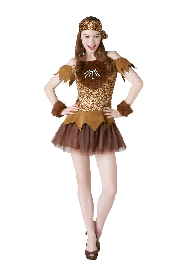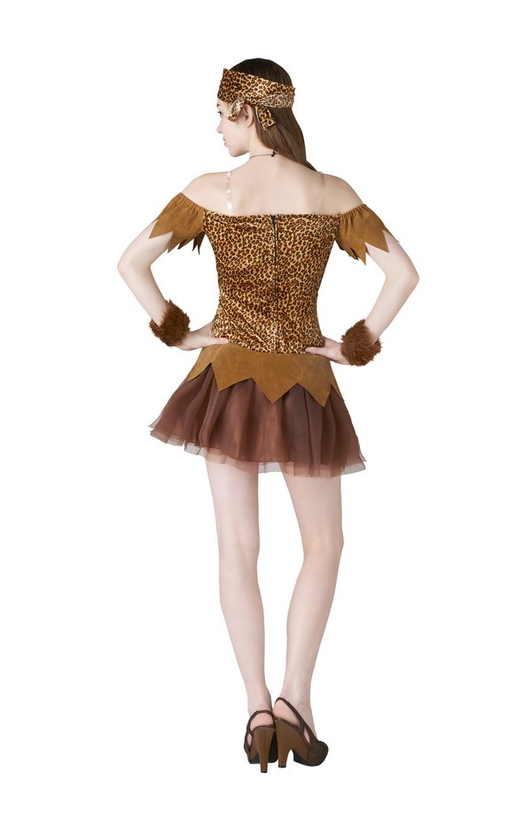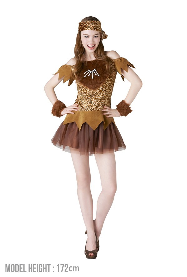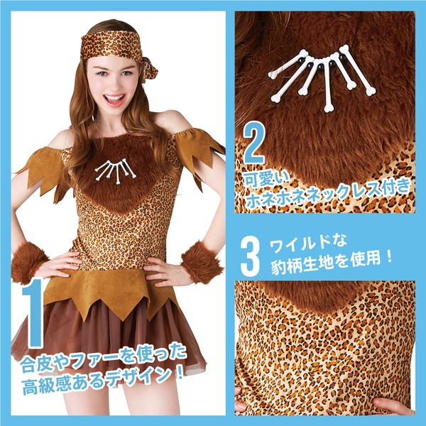 ワイルドな豹柄生地や合皮、フェイクファーなども使用した、高級感のある原始人コスチュームです。ハロウィンやイベント等の、集団仮装におすすめ☆可愛いホネホネネックレス付き♪