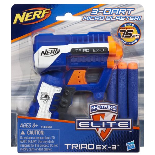 - Feature : Micro Triad EX-3 blaster has mega power / Blaster knows which barrel is loaded / Fires darts up to 75 feet / Cocking handle readies your shot / Includes blaster and 3 Elite darts / Colors may vary