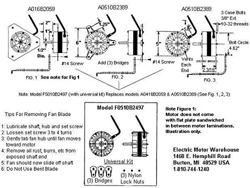 A universal mounting hardware kit comes in the box with each motor to replace older models. Do not attempt to buy a new unit and pull the motor out; the mounting has changed. The conduit (flexible cable) can be used from your previous motor simply by un-screwing it and putting it on your new motor. Lomanco motor comes with Universal mounting kit to replace the flat plate (with 3 mounting holes). Lomanco motor does not have the flat plate sandwiched in between motor laminations. If your motor mounts with a belly band around the motor (5" Diameter motor), this motor should work fine. If you need a longer shaft take a look at motor #PD144, it has a 4" long shaft with similar mounting characteristics. Replacement fan blade # 14393 available. 1 Year manufacture warranty.Feature