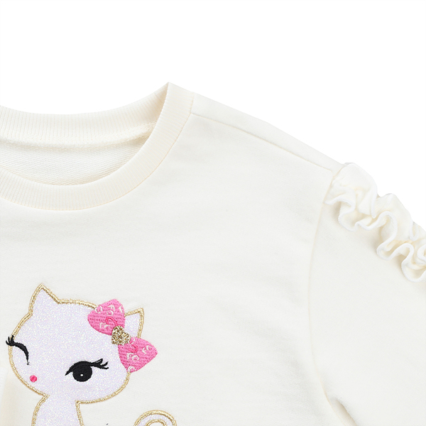 설명:산듯한 화이트 컬러의 다이마루 소재의 맨투맨입니다. 기존에 나오는 맨투맨과 다르게 소매에 제원단 프릴 장식을 주어 좀더 큐트한 디자인으로 제작되었습니다. 블링블링한 화이트 고양이 포인트로 귀여우면서 산듯한 느낌을 주었습니다. 데님 팬츠와 레깅스와 코디하여 편안하게 입히기 좋은 데일리 아이템입니다.