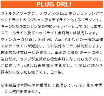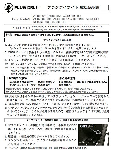 DRL (Daytime Running Lights) is that turning on the part of the front of the light even in the daytime oncoming vehicle is a system to help prevent accidents to improve the visibility of from such pedestrian. In the EU countries is the equipment that has been mandatory. [Product Description] is a plug to daylight the position of the Audi LED position lamps with a headlight. It lights up as daylight to the key-on and during engine start-up and set. Setting is very simple. Just wait a few seconds crowded difference the body to the OBD2 port. It is complete When the plug of the lamp is made from flashing orange lights. And you can set or return to many times normal. Is returned to the original in the maintenance and inspection is also ... Daylight resurrected if rice difference. Reduction by model light different off pattern. ※ plug so are managed by reading the vehicle identification number it can not be used for more than one vehicle.
