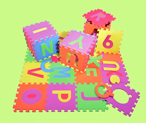 - Feature : Imagination, Creative Games, Early Education; Visual Sensory Development & Hand Eye Coordination / Safe, soft and durable; Easy to use with colorful interlocking tiles; Easy to clean with damp cloth & mild soap / Non-Toxic, tested FREE of Lead, BPA's and Phthalates; Meet or exceed the US regulated toy safety standards / 36 tiles, Letters & Numbers puzzle EVA foam mat; 6 colors: Red, Yellow, Green, Blue, Orange, Pink / Tile size: 12" x 12" x 0.4" (315mm x 315mm x 10mm); Cover area: 36 SQ. FT. (approx. 3.4 SQ. M)