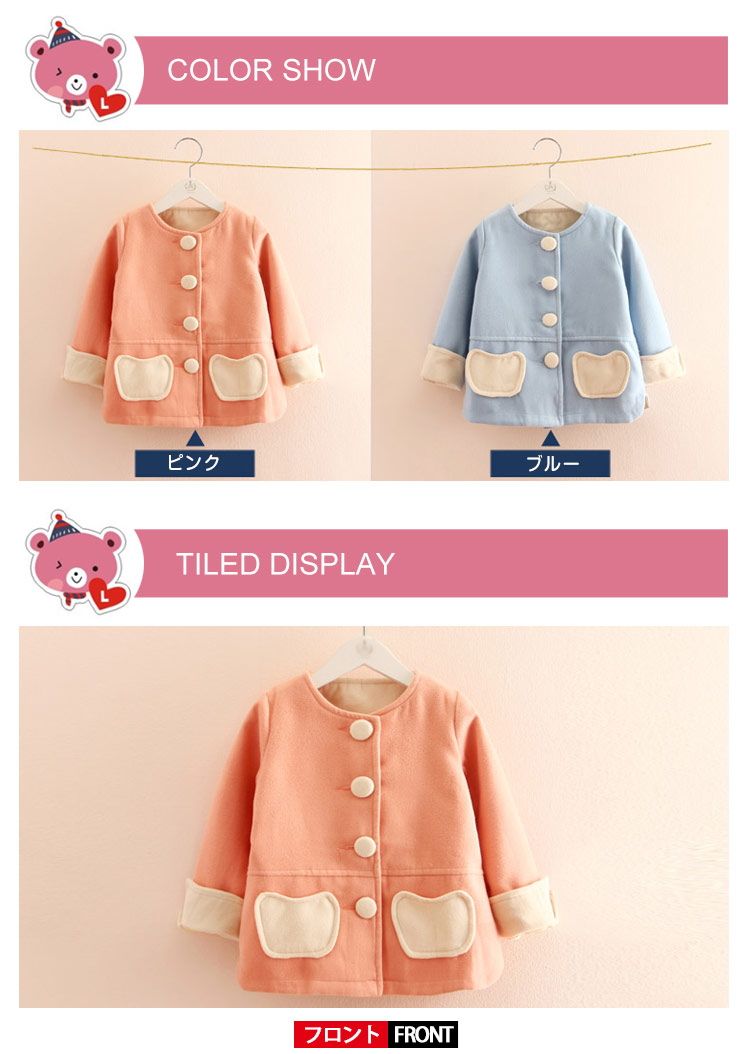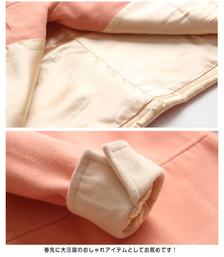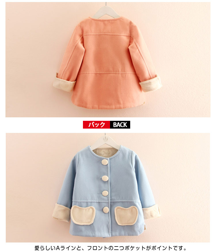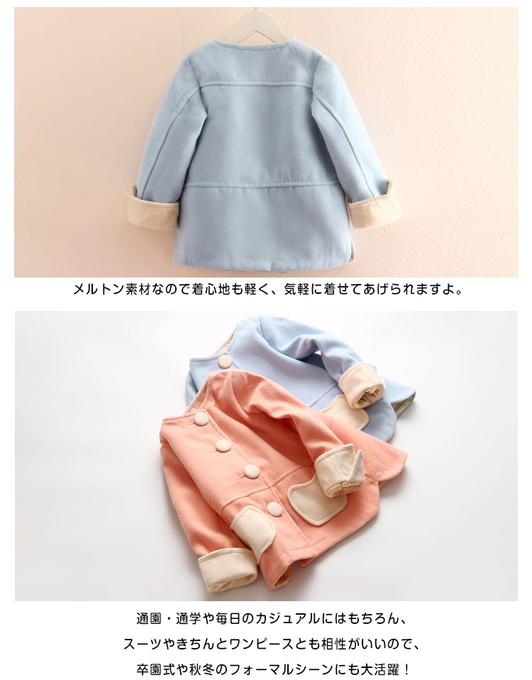 | 通学にもフォーマルにも◎の上品コート 愛らしいAラインと、フロントの二つポケットがポイントです。メルトン素材なので着心地も軽く、気軽に着せてあげられますよ。通園・通学や毎日のカジュアルにはもちろん、スーツやきちんとワンピースとも相性がいいので、卒園式や秋冬のフォーマルシーンにも大活躍! | |