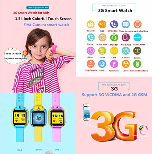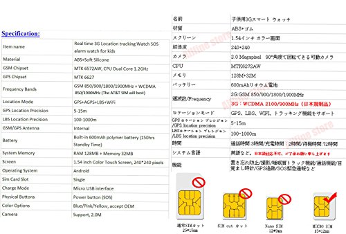-. Feature : Cellular Band :GSM 850/900/1800/1900MHz+WCDMA 850/1900MHz. Support MicroSIM only, the size is 12*15 mm,do not compatible with SIM and Nano SIM ,support 2G and 3G,we recommend AT&T sim.( NOT support for Verizon、SP.R.Int CDMA sim). the watch support GSM sim with 2G GPRS date and support SIM with 3G,if you must buy some newest version 4G LTE sim,please check with Carrier if supported with GSM850/900/1800/1900Mhz and WCDMA 850/1900MHz network service firstly before you placed order / Attractive features:3g micro sim supported,1.54inch with 240*240 resolution colorful screen,2.5D smooth quality touch panel, Rotating camera(2MP), two-way calls, multiple positioning(GPS+WIFI+AGPS+LBS), electronic fence, a key SOS, curriculum, voice chat, multiple alarm clock(Analog clock face/12hour/24hour system optional), remote monitoring. / Multi-Features: watch with SIM card to support parents and children two-way calls,GPS Tracker Location with App(supported for Android&iOS Smartphones)+Achieve all day real-time location tracing ,check the position at anytime anywhere,Fitness Tracker for child: Pedometer,Voice Chat on app,Alarm Warning of taken off etc. / Kids Smart Watch Phone is best gift for your children,blue/pink/green three optional, favorable color for girls boys.comfortable feeling with good quality food grade silicon wristband.Safe and Smart! / Warm Reminder: Cause it's very new product, for some sim card must set up APN for network then you can access the APP successfully for tracking, once you got watch please follow introduction,if meet any question just fast contact with us,our professional engineer will remote setting for your watch and make it very simple and convenient.If you need to use watch outside of US in other countries or sim operator,before placing order, please contact with us to get confirmation.