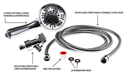 ShowerMaxx Shower Head Premium 6 Spray Settings | Luxury Spa Detachable Handheld Showerhead | Extra Long Stretchable Stainless Steel Hose, Adjustable Mount & Teflon Tape | Chrome Hand Held Finish