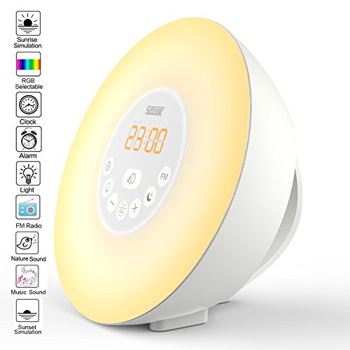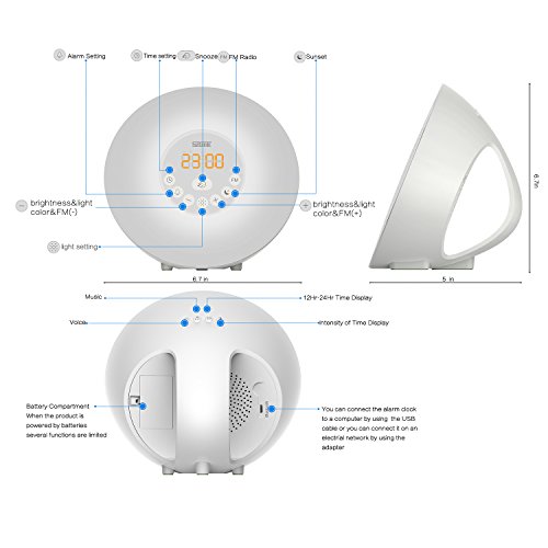 Sunrise Simulation Wake Up Light:30 minutes before your alarm time, the light brightens gradually from 10% of brightness to 100% to bring you out of deep sleep gently to welcome a refreshed day.Gently transition from night to morning. Choose from 6 nature sounds (ocean waves, river, birds, farm, rain forest so on) or your choose the seventh ringtone favorite FM radio station to wake up to.