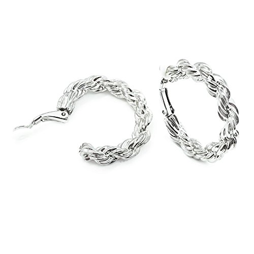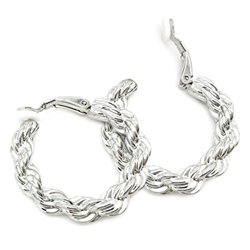 Made of rhodium plated alloy, these stylish earrings are featuring braided rope design. Measures about 6mm wide with diameter of 1.25" these hoops are secured with clip on backings. Wear these chic hoops with your jeans for daytime or with a dress for a night out. These fashion clip on earrings will make the perfect choice for your special someone for Valentine's gift, Christmas gift, Mothers day gift, Birthday gift, Anniversary Gift, or Bridal party gifts.Feature