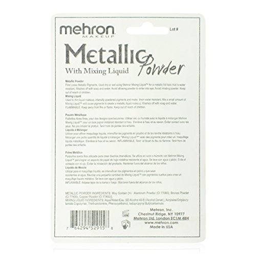 -. Binding : Toy -. Brand : Mehron -. EAN : 0764294529158 -. Feature : Create stunning metallic effects with this dynamic combination / Add dynamic shiny accents to any makeup look / Powder may be used alone or with the liquid / A variety of colors to choose from / Proudly Made in the USA since 1927 -. IsAdultProduct : 0 -. Label : Mehron -. Manufacturer : Mehron -. MPN : 129C-ML-LV -. PartNumber : 129C-ML-LV -. ProductGroup : Toy -. ProductTypeName : TOYS_AND_GAMES -. Publisher : Mehron -. Studio : Mehron -. Title : Mehron Makeup Metallic Powder .17 oz with Mixing Liquid 1fl oz - Lavender -. UPC : 764294529158