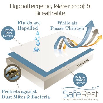 Studio : SafeRest Publisher : SafeRest Product Description SafeRest Hypoallergenic Mattress Protectors offer premium protection against dust mites, fluids, urine, perspiration and allergens making them especially helpful for those with kids, pets, allergies, asthma or incontinence. As we sleep we shed thousands of dead skin cells, which can quickly accumulate providing an ideal environment for dust mites to thrive. According to the American Lung Association, 50-80% of asthma and hay fever cases are triggered by these mites. SafeRest mattress protectors trap dust mites, allergens and skin cells on the surface of the protector where they can be easily washed away during suggested quarterly launderings. This can provide a cleaner more allergen free sleep environment for you and your family. Also, with just one unprotected fluid accident, a mattress can be completely ruined or left with a permanent stain or odor voiding the manufactures warranty. SafeRest protectors safeguard your mattress against fluids and stains. To keep our protectors cool and noiseless, the surface material is made with soft cotton terry back coated with a breathable, hypoallergenic and 100% waterproof membrane layer. To ensure a great fit, an elastic band is used on the side skirt to automatically pull excess material under the mattress. SafeRest pillow protectors are also recommended for added dust mite, fluid and allergen protection. Periodically machine-wash the protector with your sheets and tumble dry on the low heat setting. To demonstrate our commitment to quality, all SafeRest protectors are backed by a full replacement 10-year product warranty. SafeRest mattress protectors also contain no phthalates, vinyl or PVC's and are registered as a class 1 medical device with the FDA. Protect yourself, your family and your mattress with a premium SafeRest Mattress Protector. 0