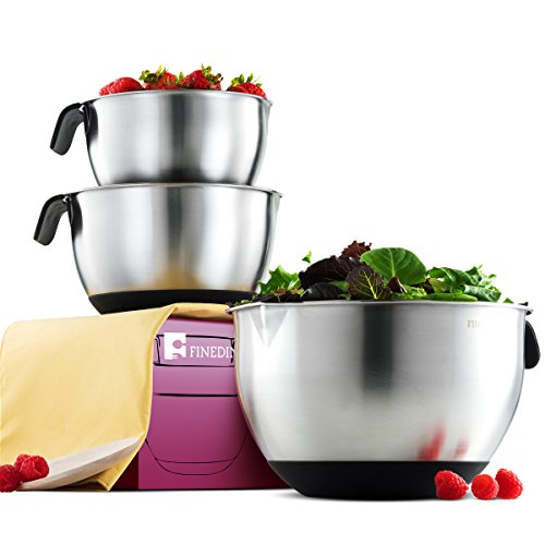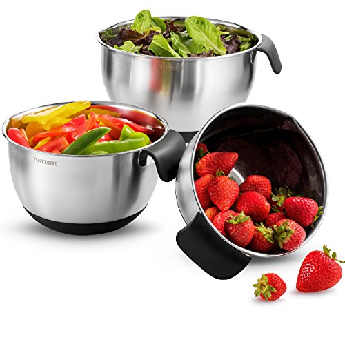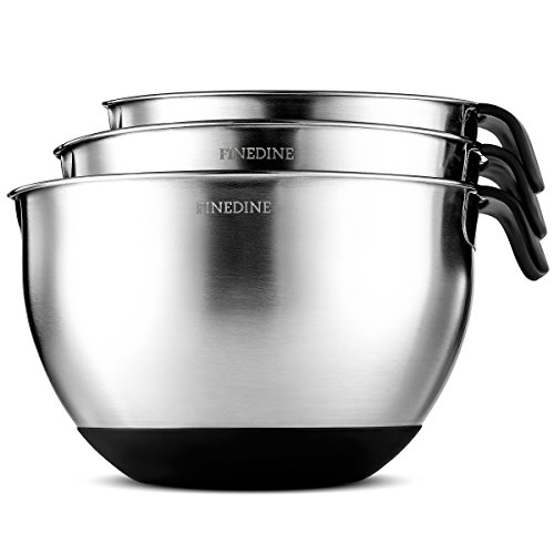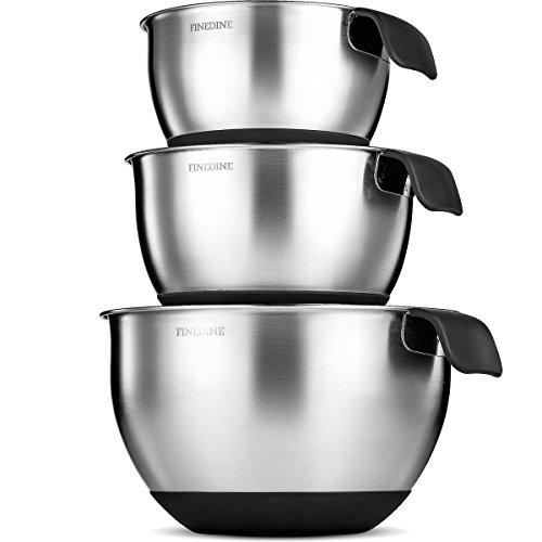 FineDine 3 piece mixing bowls set made of premium grade stainless steel and high quality rubber allow users to measure, mix, pour, and serve food all in one kitchen tool!. The metal bowls have convenient features such as a pour spout, measurement marks, rubber handle and non-slip bottom.