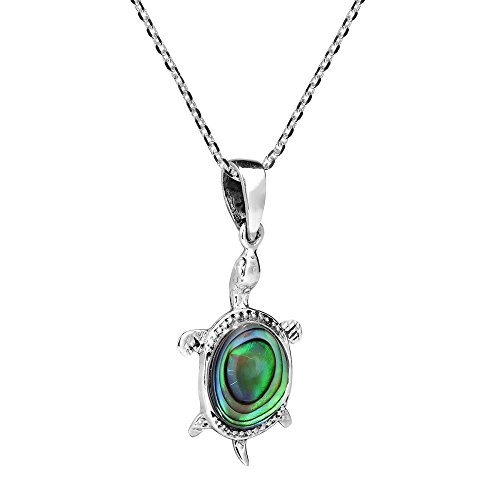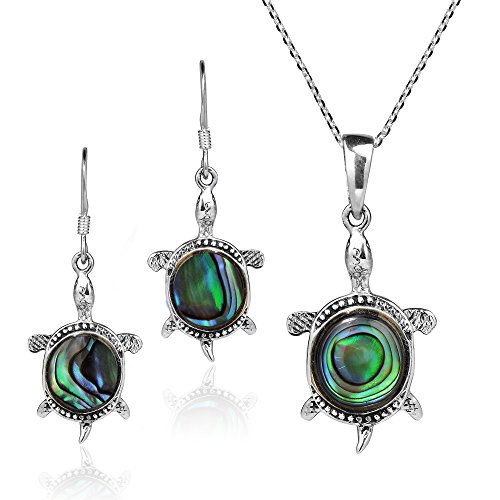 Hand crafted by Thailand's Goong, this collection showcases the beautiful and endangered sea turtle with abalone shell inlays upon its shell and .925 sterling silver detailed with oxidized contrasts. The set includes a pair of earrings and a pendant with an 18 inches cable chain. This is a popular set with women of all ages and works great for both casual and evening styles. PLEASE NOTE: The handcrafted nature of this product will produce minor differences in design, sizing and weight. Variations will occur from piece to piece, measurements may vary slightly.AERAVIDA works directly with gifted and talented Artisans from all over the world. At the core of our philosophy is fair trade and fostering a sustainable future for our Artisans.