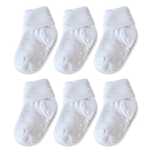 Skola Unisex-Baby Non-Skid Turn Cuff Cotton Socks 6 Pairs Pack,Soft Stretch Knit Slippers Infant Toddler Walker with Grip (2-4years, white)