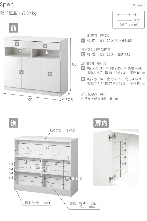 ●背面収納部有効内寸(下段):幅42x奥行7x高さ43(間口高さ41)cm(2か所)