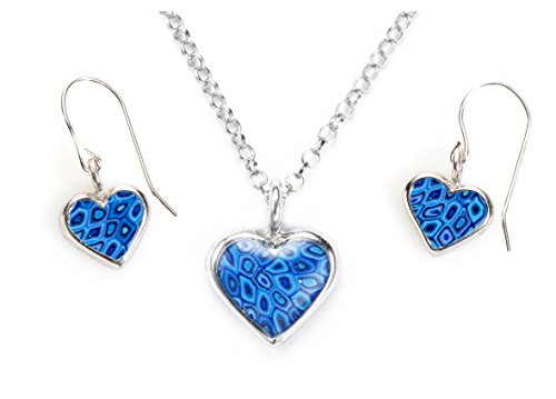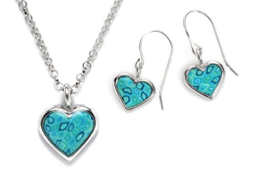 This romantic 925 sterling silver heart charm necklace and matching dangle heart earrings jewelry set adorns the beautiful and symbolic love amulet intricately created by hand using polymer clay. The heart charm is beautifully handcrafted by using the incredible millefiori technique, a gift symbolizing the seat to the soul. Enchanted by a radiant choice polymer clay finishes and coated with enamel, you can be certain this exquisite jewelry set will remain as glorious as the moment you set eyes on it. The heart charms, measures just 0.4x0.4 inches, 1x1cm, and sweetly suspends from a 16.5 inches, 42cm 925 sterling silver chain and 925 sterling silver fish hooks. Choose from Multi-colored millefiori flowers, turquoise-colored, blue or red polymer clay finishes. A romantic anniversary gift idea for any loved one; your wife, girlfriend, best friend, mother or a special treat just for you! Transform yours or her look with beautifully timeless and colorful jewelry.