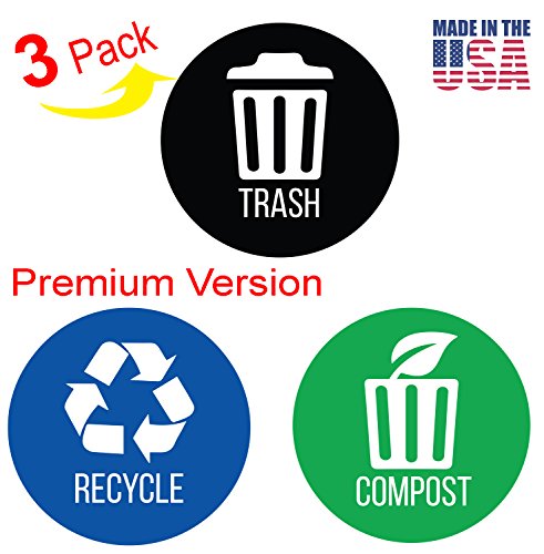 - Coordinate your Trash / Recycling / Compost Bins – Quick and easy separation and disposal with clear markings for each bin. 4" x 4" diameter with large lettering and picture decals to label each bin.