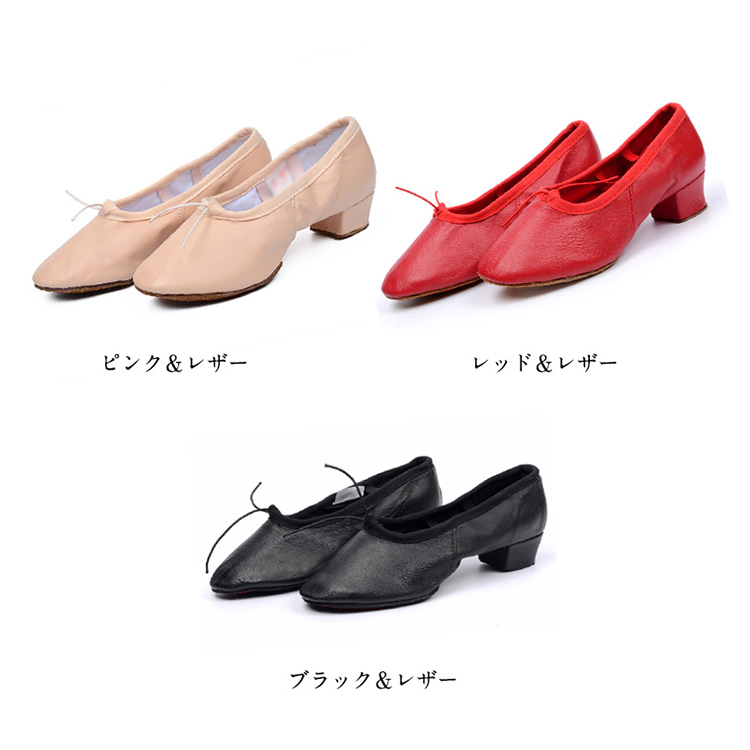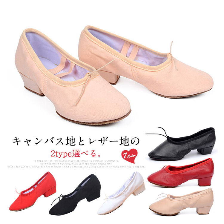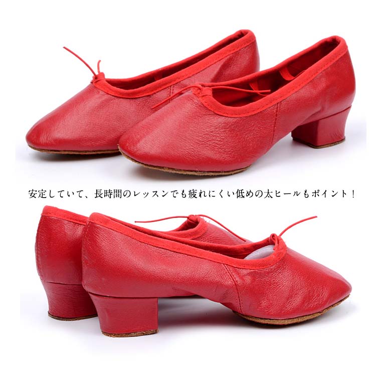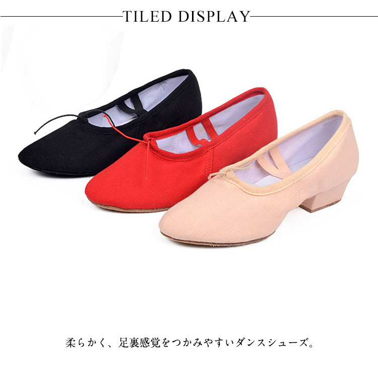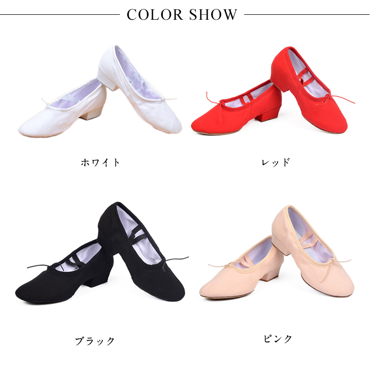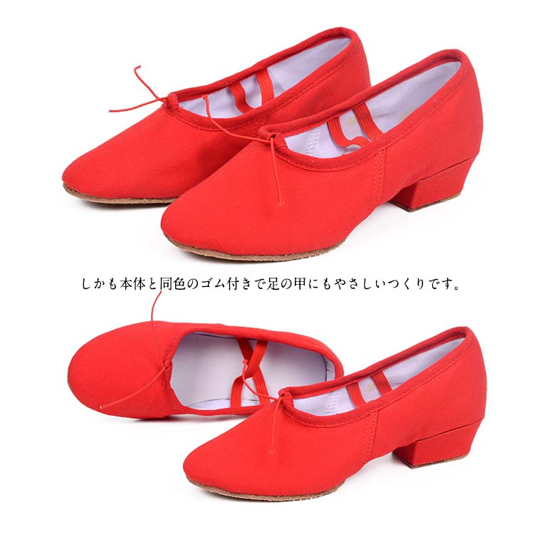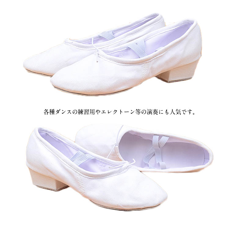 | キャンバス地とレザー地の2type選べる。柔らかく、足裏感覚をつかみやすいダンスシューズ。安定していて、長時間のレッスンでも疲れにくい低めの太ヒールもポイント!しかも本体と同色のゴム付きで足の甲にもやさしいつくりです。各種ダンスの練習用やエレクトーン等の演奏にも人気です。 | |