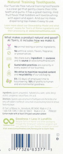 -. Binding : Health and Beauty -. Brand : Tom's of Maine -. EAN : 0785479196477 -. Feature : Training Toothpaste / Mild Fruit Flavor / No Artificial Flavors, Colors or Preservatives / Safe if Swallowed / Gently Cleans Teeth & Gums -. IsAdultProduct : 0 -. Label : Tom's of Maine -. Manufacturer : Tom's of Maine -. MPN : 738655 -. PackageQuantity : 1 -. PartNumber : 738655 -. ProductGroup : Beauty -. ProductTypeName : HEALTH_PERSONAL_CARE -. Publisher : Tom's of Maine -. Studio : Tom's of Maine -. Title : Tom's of Maine Toddler's Fluoride-Free Natural Toothpaste, Mild Fruit 1.75 oz (Pack of 2) -. UPC : 785479196477