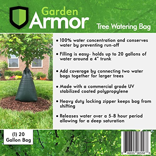 -. Brand : Garden Armor -. Color : Green -. Feature : 100% water concentration, conserves water by preventing run-off / Holds up to 20 gallons and wraps trunk sizes of 4". Can expand with multiple bags / Made with commercial grade UV stabilized coated polyethylene / Heavy duty locking zipper keeps bag from shifting / Releases water over a 5-8 hour period allowing for a deep saturation -. Label : LS3G -. Manufacturer : LS3G -. Model : 20TWB -. MPN : 20TWB -. PackageQuantity : 1 -. PartNumber : 20TWB -. ProductGroup : Lawn & Patio -. ProductTypeName : OUTDOOR_LIVING -. Publisher : LS3G -. Size : 20g -. Studio : LS3G -. Title : 20 Gallon Slow-Release Tree Watering Bag -. Warranty : Warranty covers any defects in parts, materials and workmanship for up to 3 years from the original date of purchase