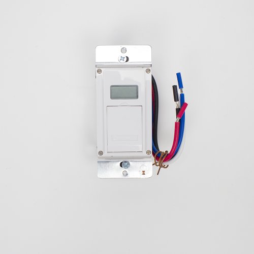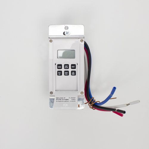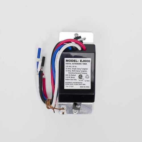 The EJ600 (White) Digital In-Wall Timer will replace a standard or decorator indoor wall switch. It is good for use with lights, fans, pumps and other medium duty loads. Compatible with incandescent/fluorescent/CFL/LED lights. Flush mounted sleek design. Built-in rechargeable Lithium ion battery back-up. 7 ON/7 OFF settings per day. Programming options: same settings Monday-Friday, same settings Saturday and Sunday, same settings every day of the week or individual daily settings. Random feature turns lights ON/OFF at different times each day to give the house a lived-in look and deter burglars. Automatic daylight saving time adjustment. 12 Amp General Load, 120 VAC, 60 Hz, 4 amp ballast and tungsten.Feature