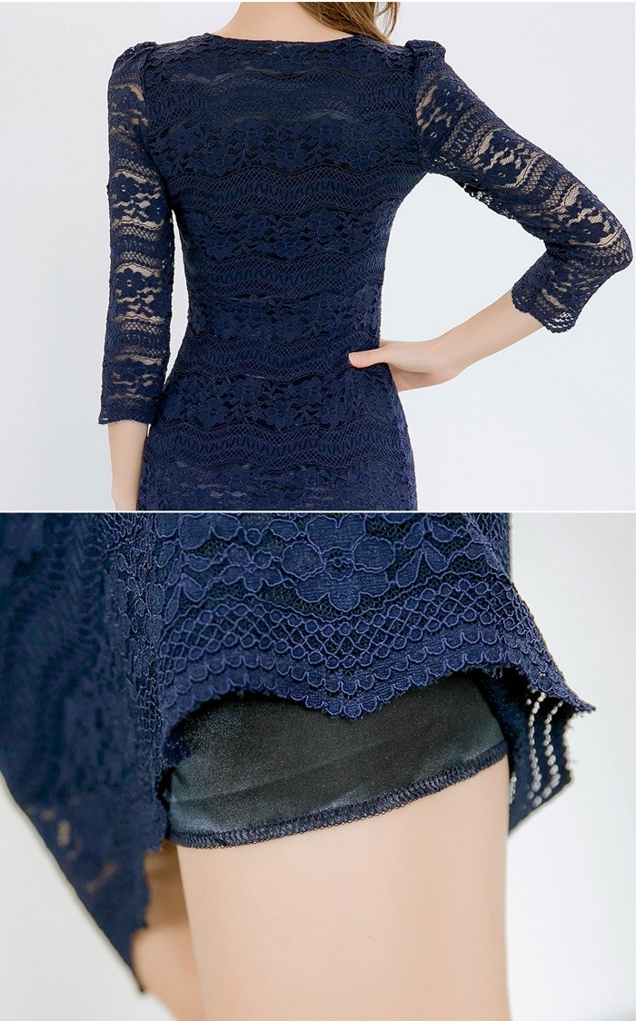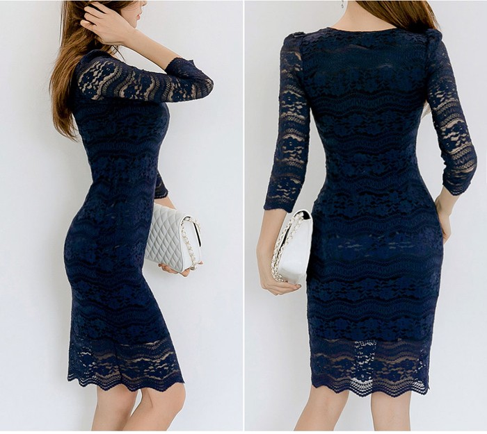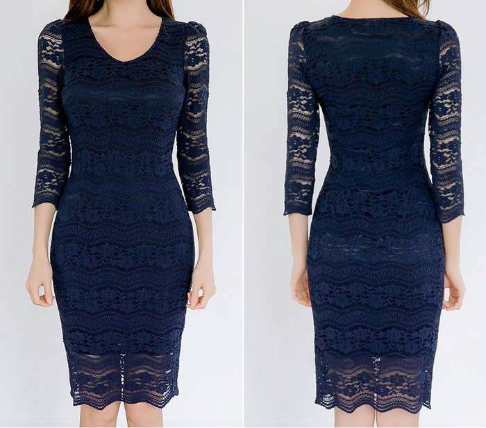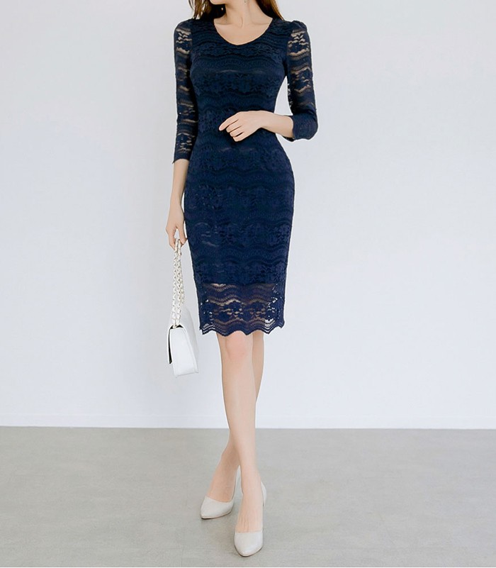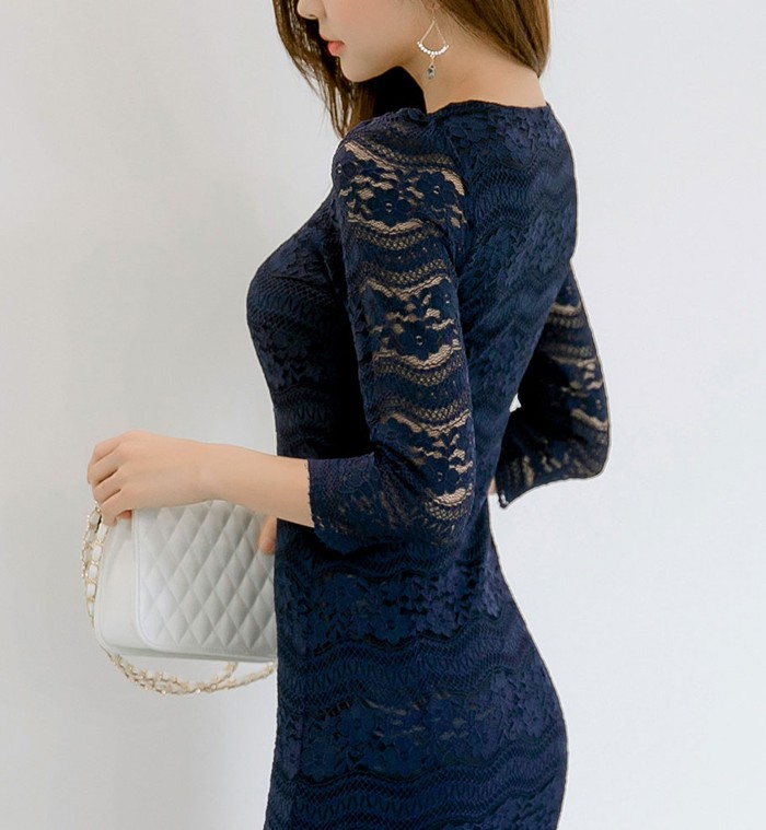 商品名:ワンピース タイトワンピース レース きれいめ 通勤 無地 7分袖