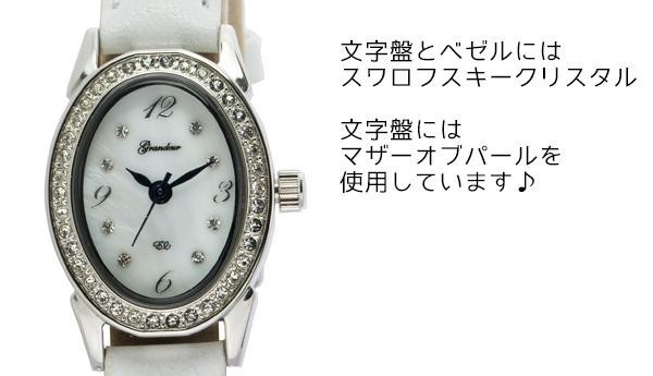 スワロフスキークリスタルを使用したレディースウォッチです。文字盤中央にはマザーオブパールを使用しています。 |
