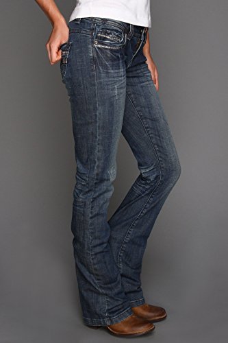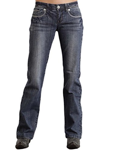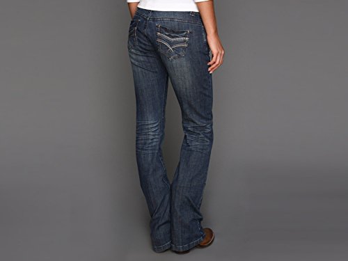 Low rise, a slim fit through the thigh with a boot cut that begins at the knee. Five-pocket design. Unique stitch detail at front and back pockets. Contrast stitching throughout. Belt loop waistband. Button zipper fly. 98% cotton, 2% spandex. Machine wash cold, tumble dry low. Imported.