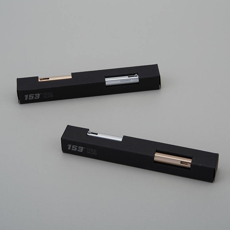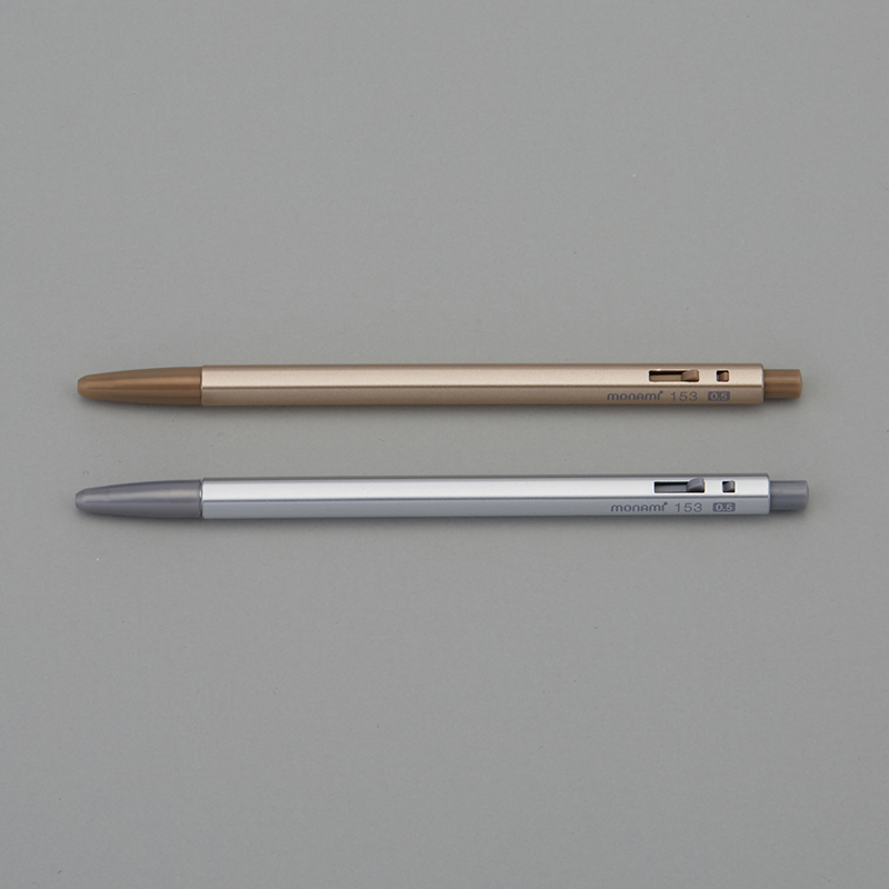 모나미 153 볼펜 시그니처의 골드/실버 플라스틱재질의 유성볼펜입니다.