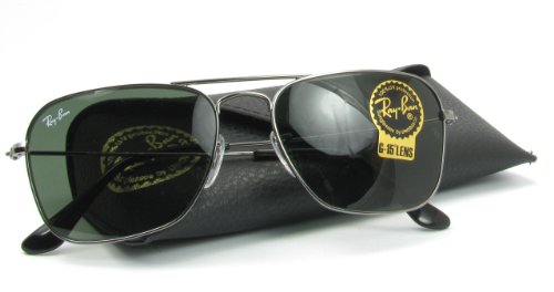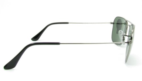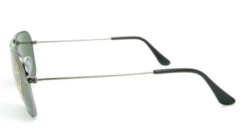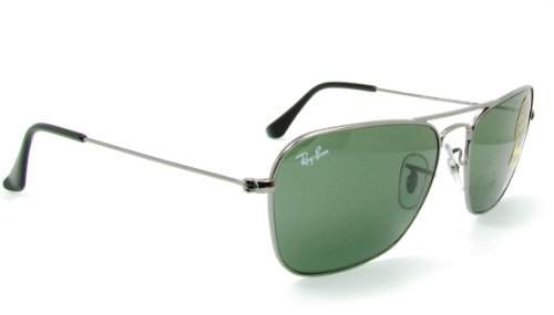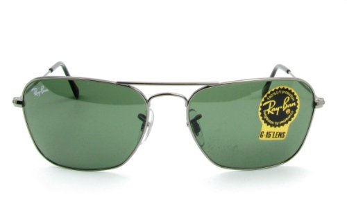 Ray-Ban Caravan sunglasses were designed as a streamlined alternative to the classic aviator. Gunmetal frame and green lenses. Silicone nose pads. Case and cleaning cloth included.