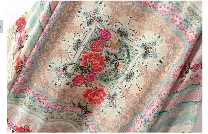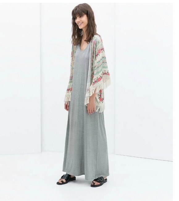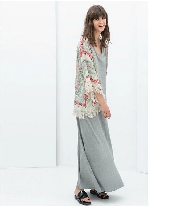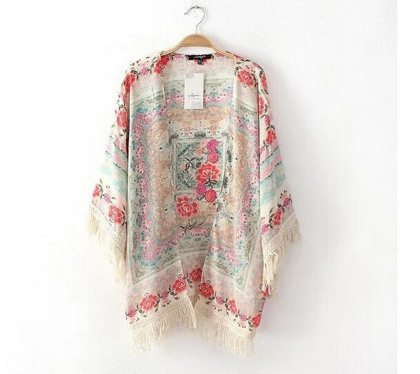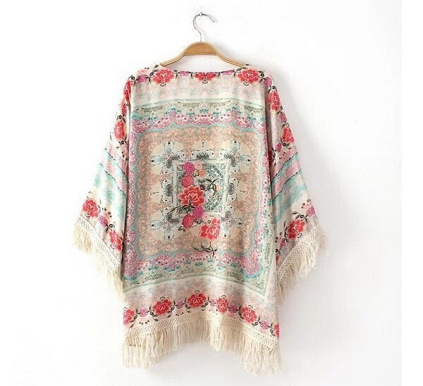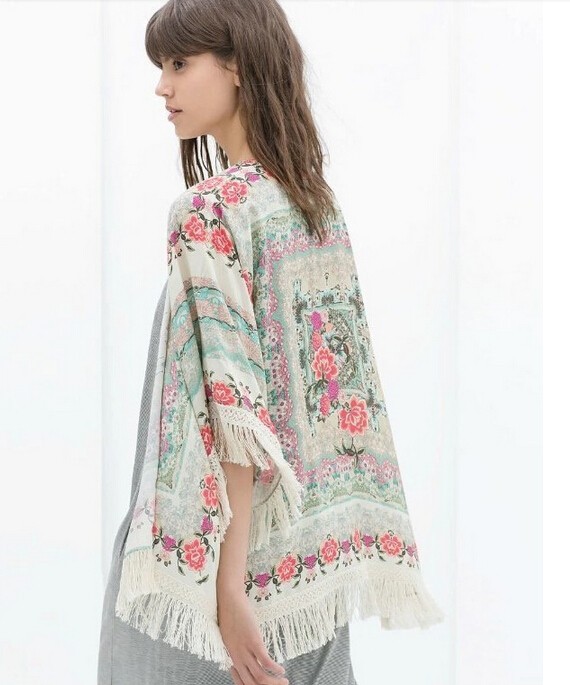 2015 Hot Sale spring summer ladies floral pattern coat tassel cape kimono cardigan tops women casual loose outwear